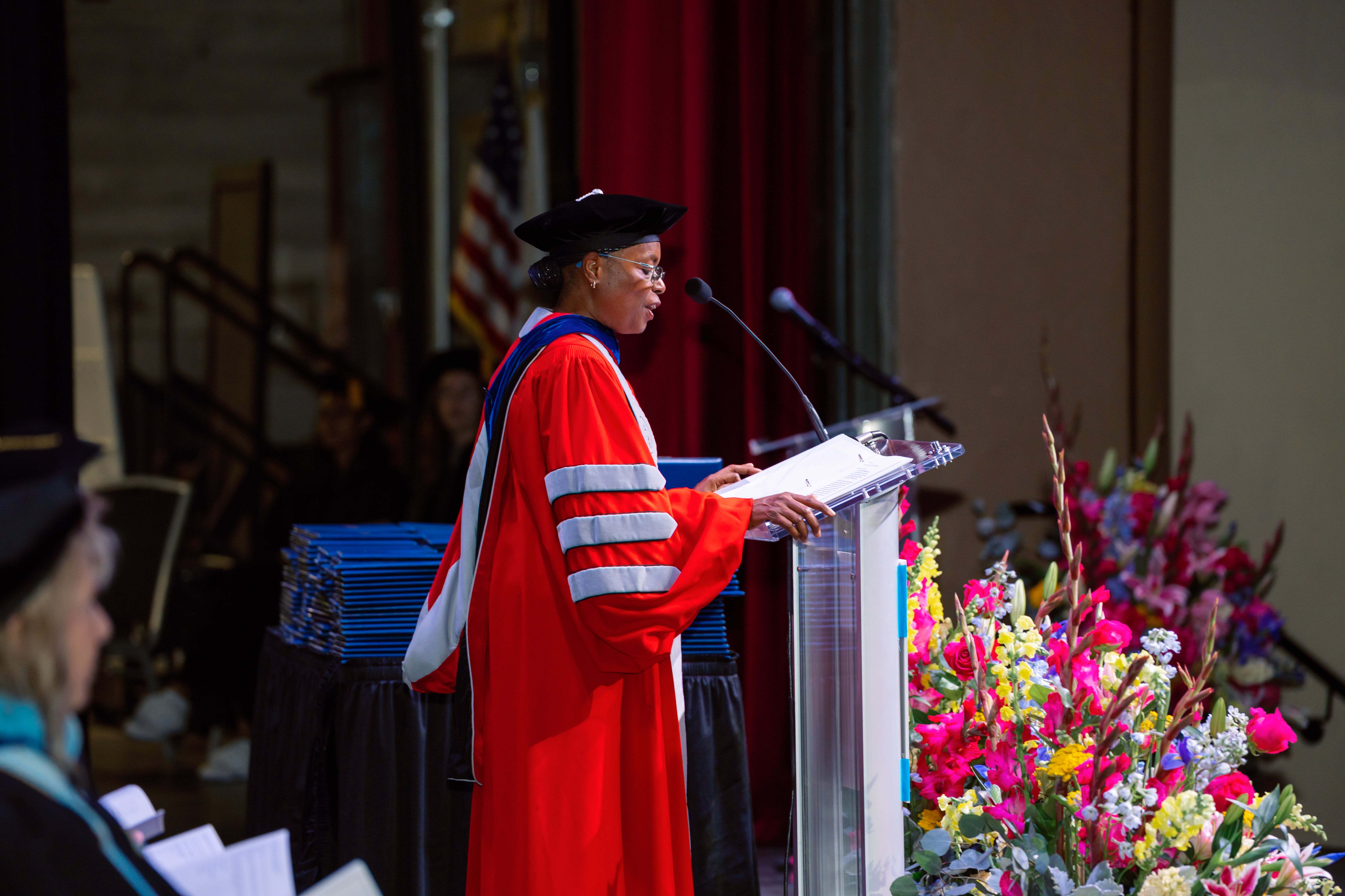 Interim Provost Sharon J. Washington, PhD, opened the 46th commencement ceremony by honoring the network of family, friends, and mentors whose quiet support carried each student to this moment. “Any one of you who provided a meal when the student was too tired to cook for themselves…offered hugs and were there to listen about anything and everything,” she said, inviting graduates to recognize those who stood beside them.